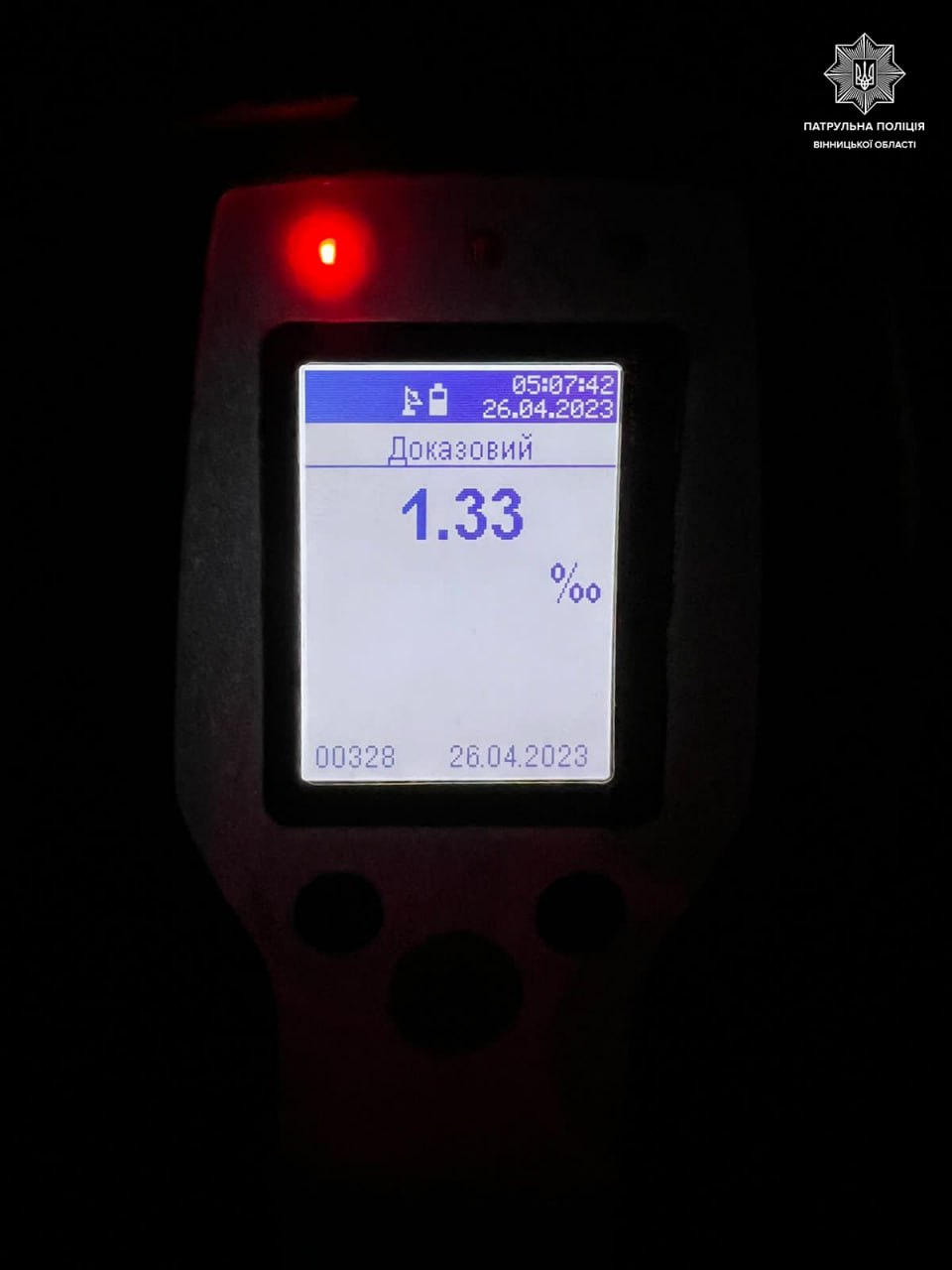 Інспектори помітили в нього ознаки сп'яніння: запах алкоголю, порушення координації рухів. Водієві запропонували пройти перевірку на Drager. Алкотестер показав в організмі чоловіка 1,33 проміле алкоголю, що майже у 7 разів перевищує допустиму норму.