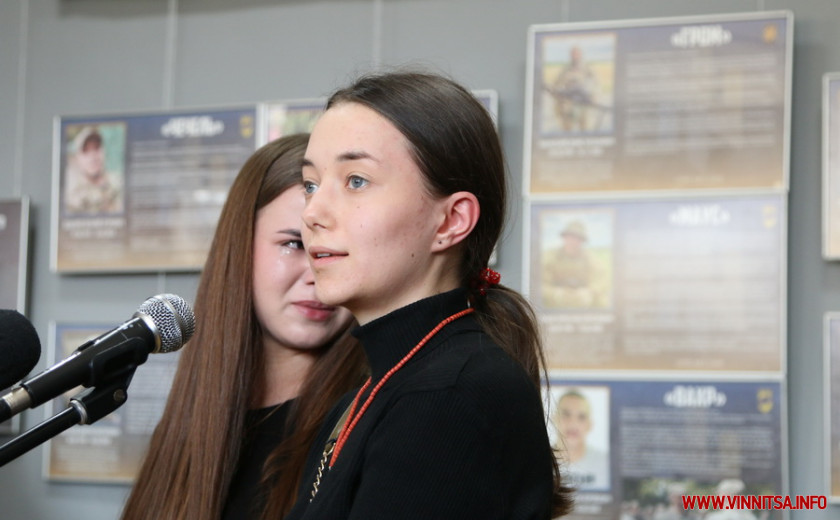 «Хочу подякувати родинам хлопців, які тут зараз знаходяться, які знайшли сили прийти. І дякую всім людям, які прийшли вшанувати наших героїв. Я працюю з бійцями полку «Азов» по своїй справі, роблю оголошення про прощання, портрети, які мають тримати на похороні і це моя перша така велика робота. Я робила оформлення цієї виставки. І за весь цей час, коли я працюю з хлопцями, з їх рідними, з їх родинами, в мене виникає таке відчуття – наше я і не жива, і не мертва. Мій чоловік також тут є…