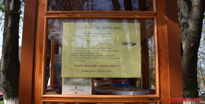Вулична бібліотека працює щоденно: з 8:00 до 20:00 години.