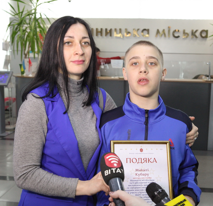 До Всесвітнього дня поширення інформації про аутизм, який проходить 2 квітня, у холі Вінницької міської ради традиційно відкрилась щорічна вінницька міська художня виставка робіт дітей з інвалідністю «Запали місто синім». В цьому році тут представлені роботи Микити Кубаря. В експозиції персональної виставки юного художника представлено 30 картин, де зображено пейзажі, натюрморти.