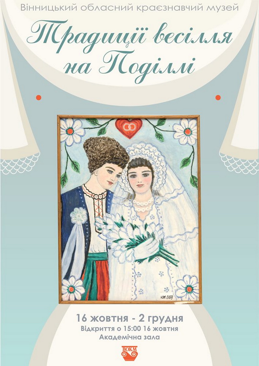 16 жовтня в Академічній залі Вінницького краєзнавчого музею відкриють виставку «Традиції весілля на Поділлі». Тут представлять весільний одяг та прикраси, фотографії подолян від початку 20 століття.