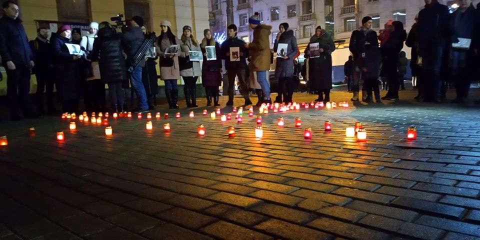 Організатори спільно з учасниками акції розклали лампадки у формі літака та роздали присутнім фото українців, які перебували на борту літака. Пам’ять загиблих вшанували хвилиною мовчання.