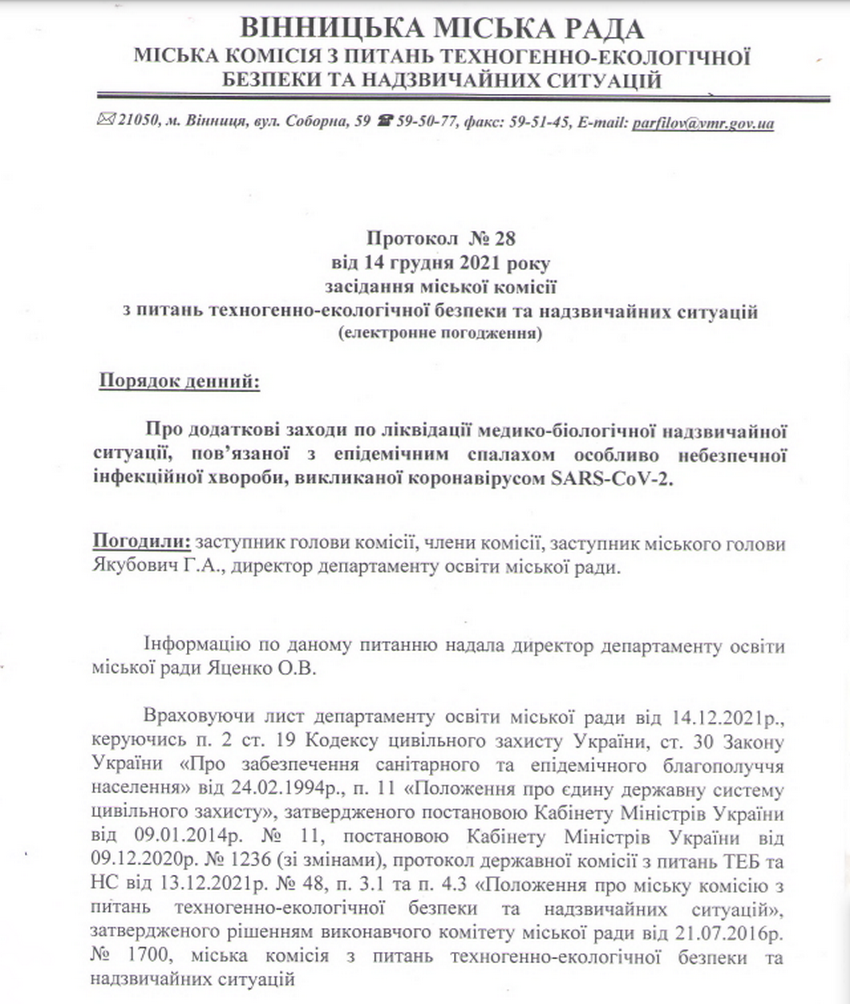 Вінницька міська комісія ТЕБ НС 14 грудня прийняла рішення про організацію освітнього процесу для учнів 5-11 класів в звичному режимі з дотриманням карантинних вимог.