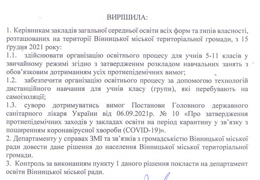 «Керівникам закладів загальної середньої освіти всіх форм та типів власності, розташованих на території Вінницької міської територіальної громади, з 15 грудня: