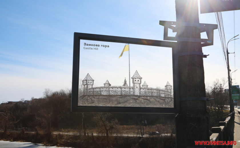 У Вінниці, на Староміському мосту, встановили прозору табличку із контурами Замкової гори. Вінничани можуть побачити, як колись виглядала фортифікаційна споруда, на місці якої зараз височіє найбільший в області прапор.