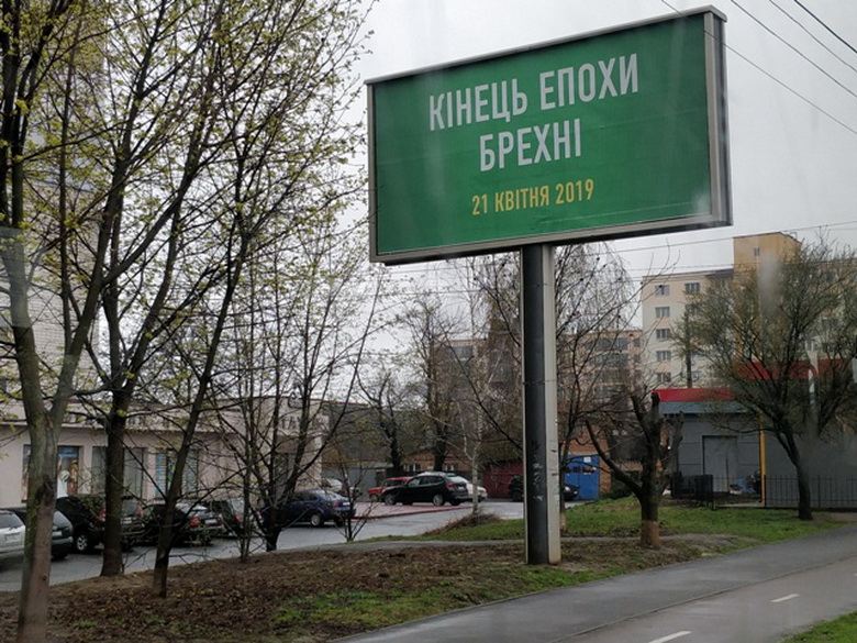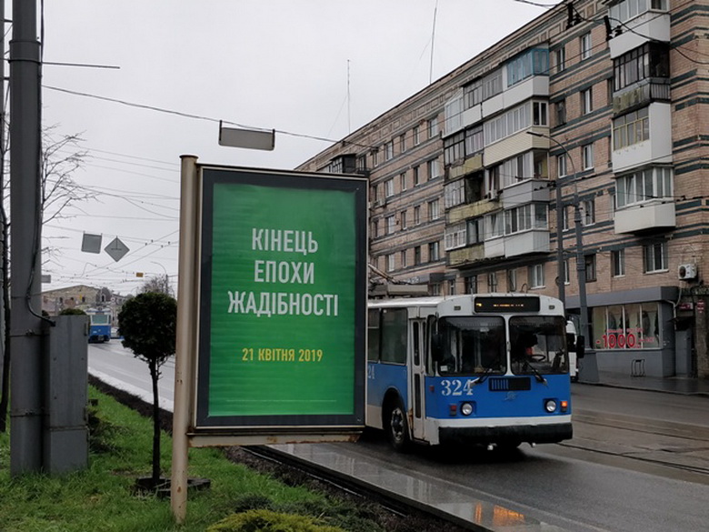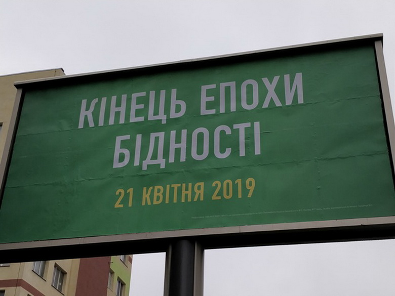 Так, білборд на користь Володимира Зеленського із гаслом «Кінець епохи жадібності. 21 квітня 2019» розміщено на вулиці 600-річчя, із гаслом «Кінець епохи бідності. 21 квітня 2019» – на вулиці Замостянській, а із гаслом «Кінець епохи брехні. 21 квітня 2019» – на вулиці Келецькій. Сітілайт із написом «Кінець епохи жадібності. 21 квітня 2019» розміщено на вулиці Соборна.