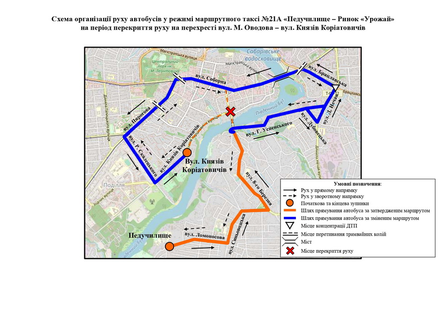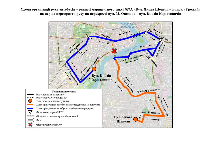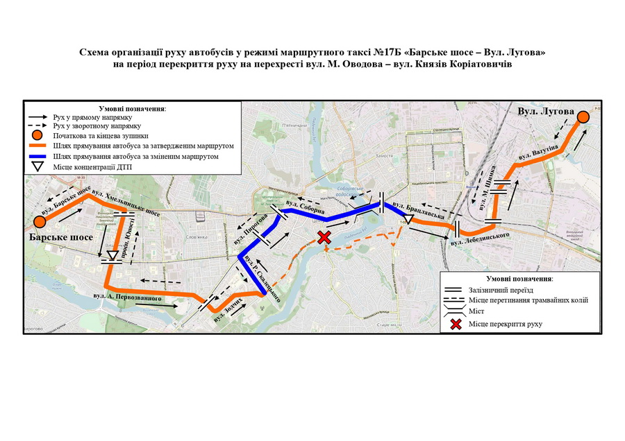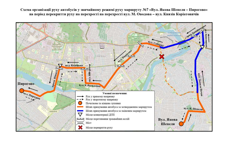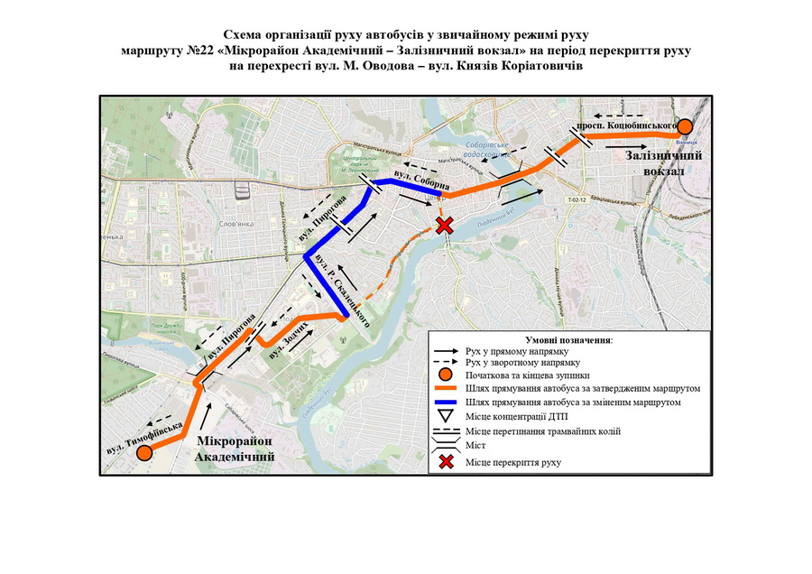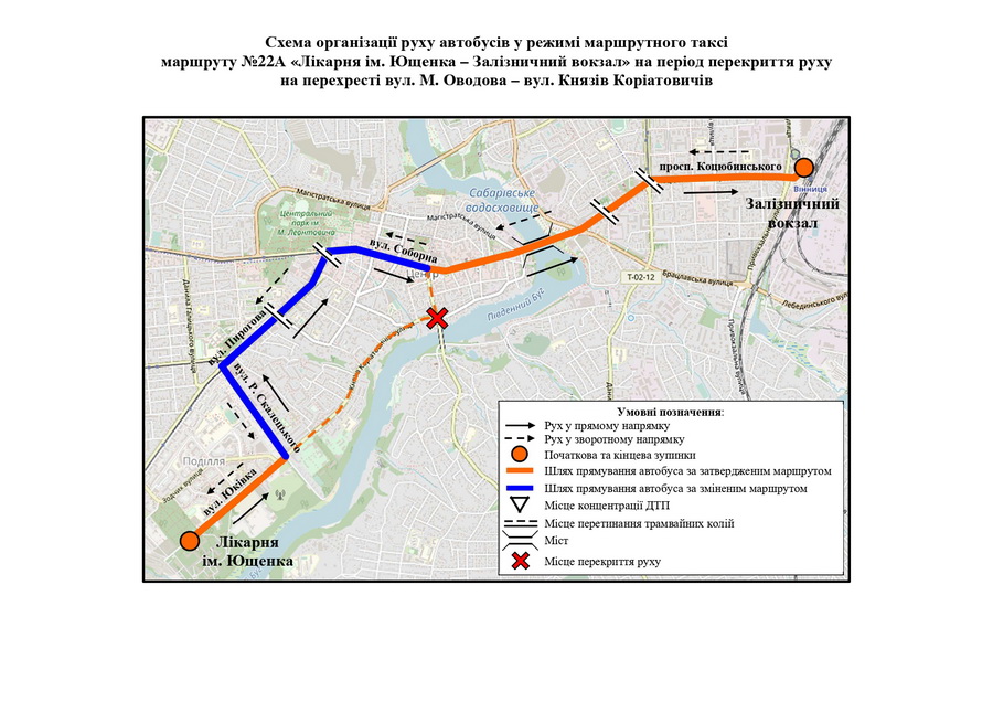 Автобуси № 22, маршрутні таксі № 17Б та № 22А прямуватимуть по вул. Зодчих, вул. Р. Скалецького, вул. Пирогова, вул. Соборній, через центральний міст.