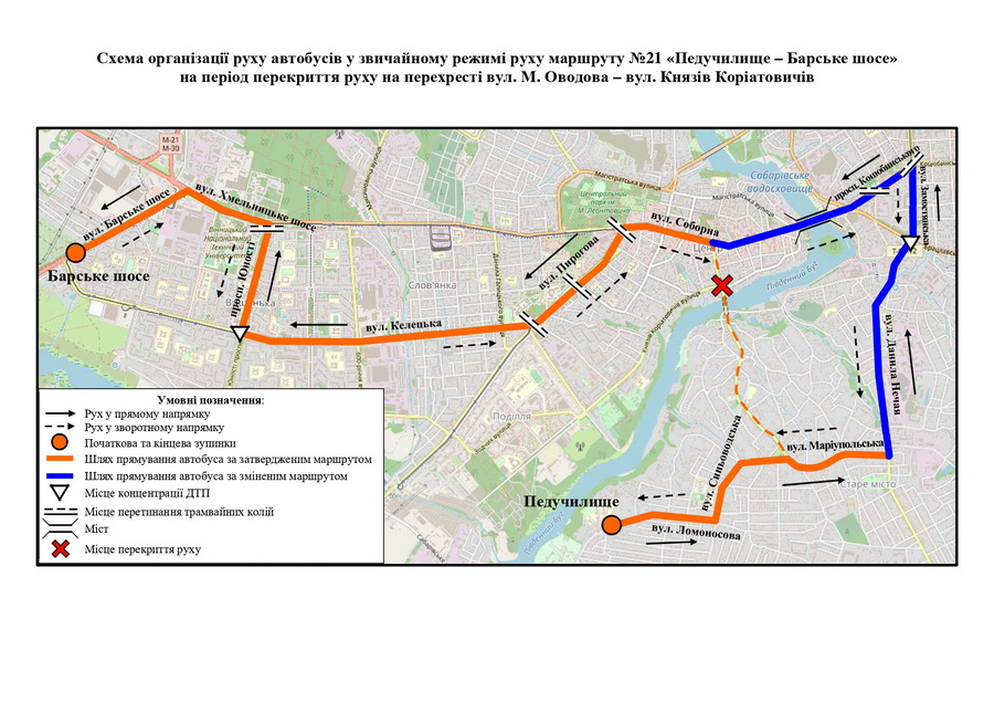 Маршрутні таксі № 7А та № 21А прямуватимуть від кінцевого пункту тролейбусів «Вул. Князів Коріатовичів» по вул. Князів Коріатовичів, вул. Родіона Скалецького, вул. Пирогова, вул. Соборній, через центральний міст, по вул. Брацлавскій, вул. Гліба Успенського, вул. 8-го березня. Відповідно цими ж вулицями й у зворотному напрямку.