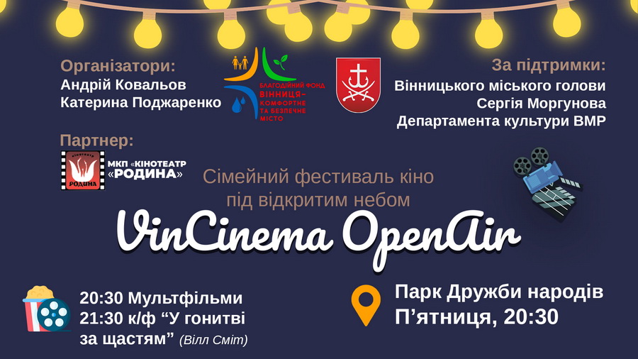 На березі Вишенському озері, у Парку Дружби влаштовують вечір у супроводі Сімейного фестивалю кіно під відкритим небом VinCinema OpenAir.