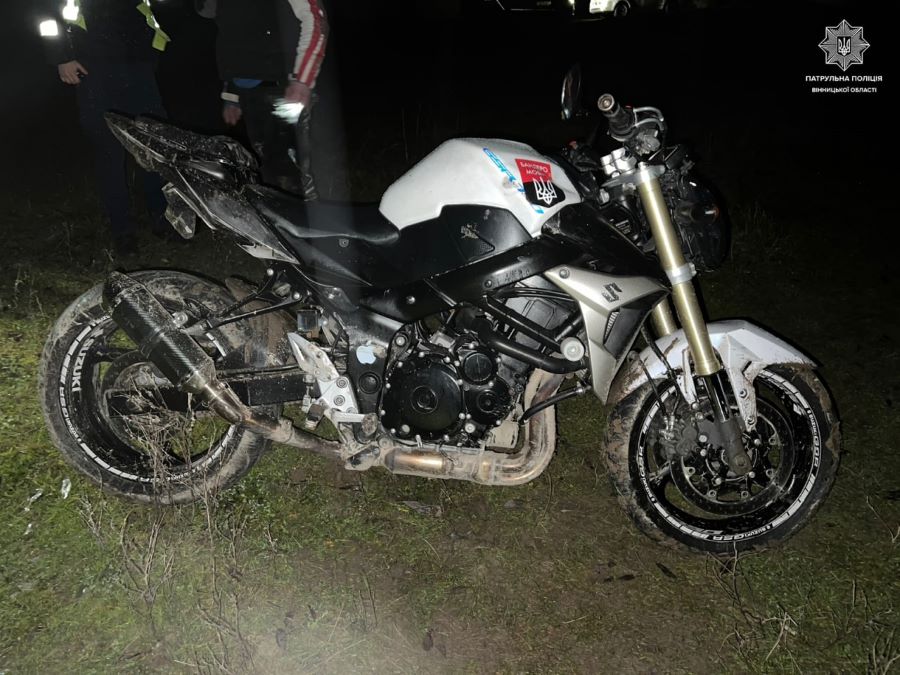 Сьогодні вночі у Вінниці на вулиці Максима Шимка патрульні помітили мотоцикл Suzuki, який проїхав на заборонний сигнал світлофора. Інспектори подали порушнику сигнал про зупинку, але він лише пришвидшив рух. Поліцейські зупинили втікача шляхом блокування у селі Вінницькі Хутори.
