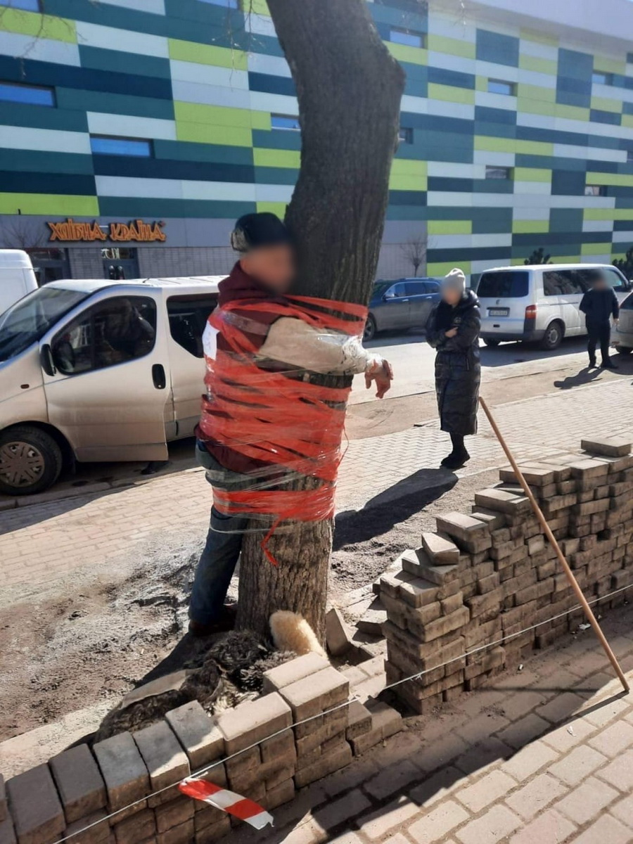 Чоловіка затримала охорона торговельного закладу та викликала поліцію. Поки поліція їхала, мародера прив’язали скотчем до дерева. Правопорушник затриманий у процесуальному порядку та поміщений в ізолятор тимчасового тримання.