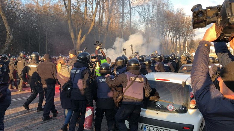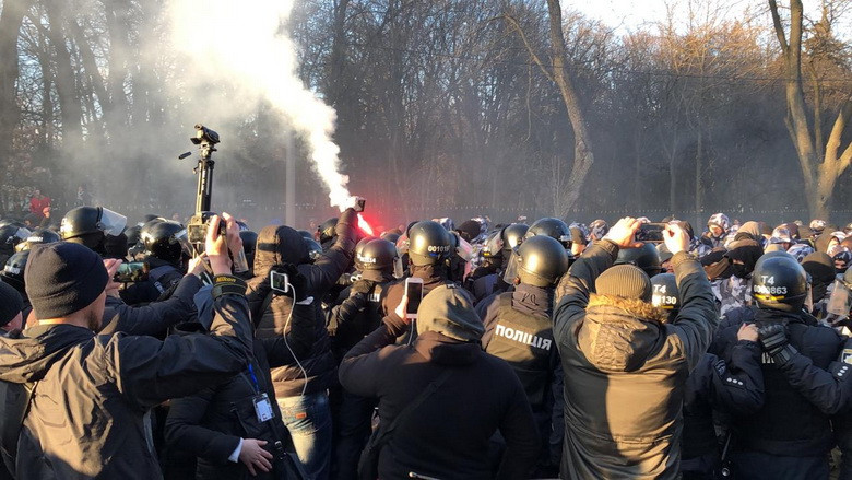 «За порушення громадського порядку, поліцейські затримали трьох осіб. Вони застосували газ дратівливої дії. Відносно правоохоронців кидалися камінням, застосовували піротехнічні засоби. Також намагалися вчинити дестабілізацію ситуації під час проведення масових заходів, які сьогодні анонсувалися. Прийшло багато людей.