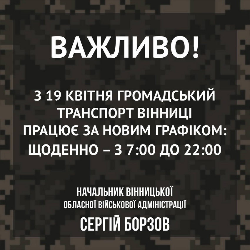 На численні звернення жителів міста підписав наказ про зміни у роботі громадського транспорту: з 19 квітня у період дії воєнного стану КП «Вінницька транспортна компанія» здійснює пасажирські перевезення щоденно з 7 год. до 22 год.