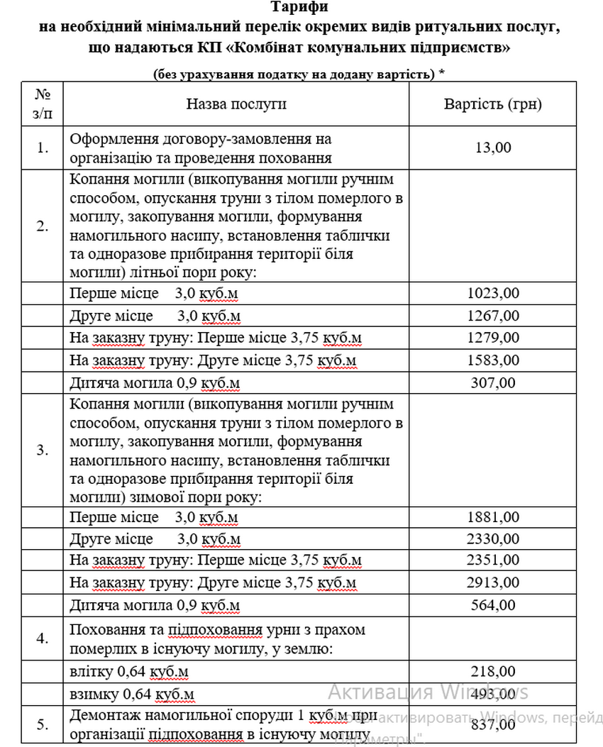 Вартість послуг зросте майже вдвічі. Наприклад, зараз оформлення договору-замовлення на організацію та проведення поховання коштує 8,48 грн (без ПДВ), буде - 13,00 грн. Копання могили влітку (перше місце 3,0 куб. м) коштує 561,93 грн, буде - 1023,00 грн (без ПДВ).