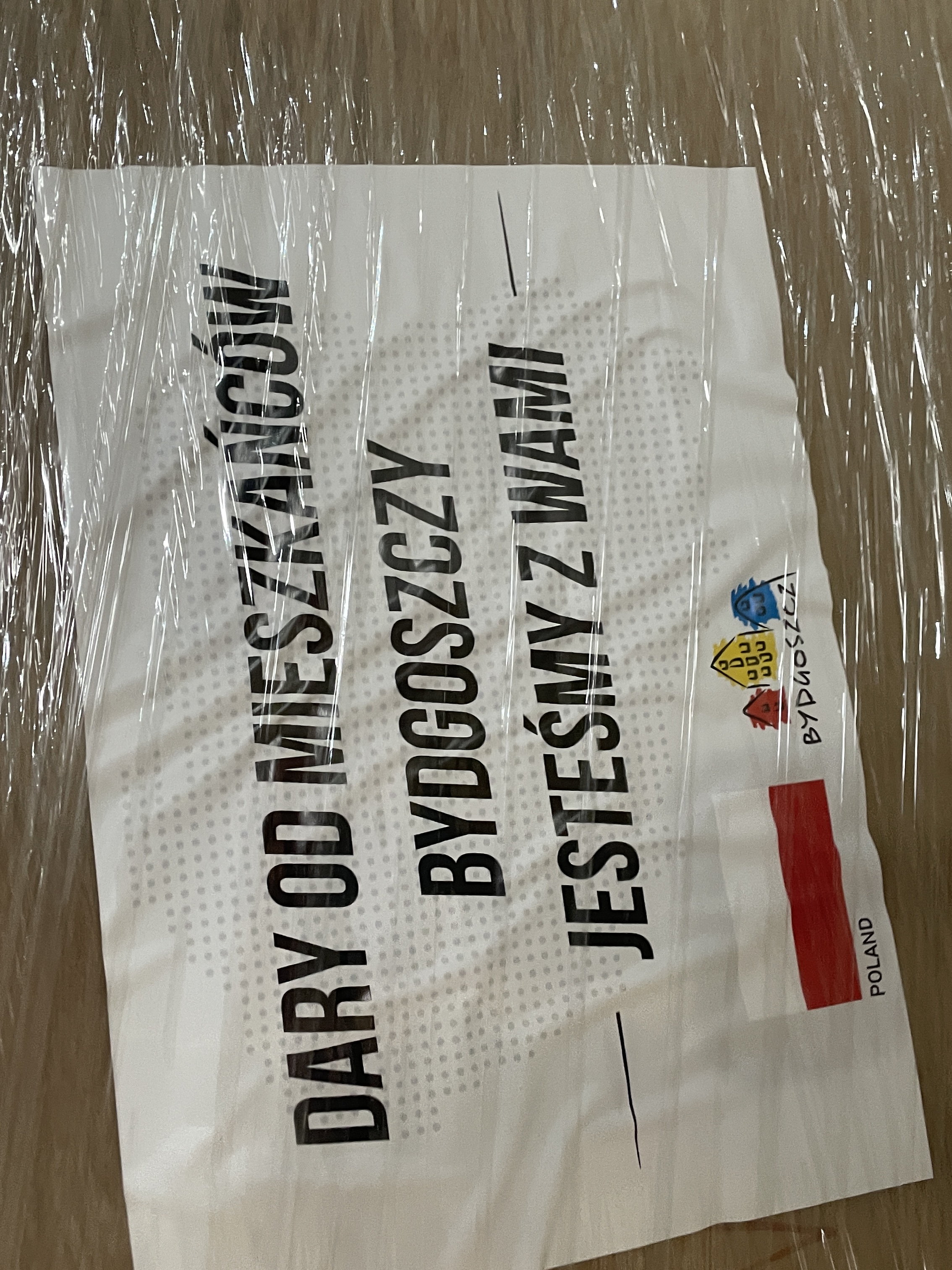 «Отримали черговий вантаж з польського міста Бидгощ. Це продукти харчування, медикаменти, засоби гігієни, спальники.