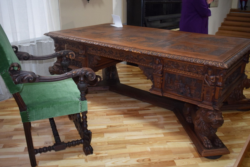 Стіл вражає своєю величністю та композиційністю: ніжки у вигляді лежачих левів з відкритими пащами; всю поверхню займає різьблення; підстілля прикрашене різьбою з рослинним орнаментом, символічними знаками масонського типу (півмісяцем, зірками, двома схрещеними молотами), геральдичними знаками, грифонами, поясними чоловічими фігурами.