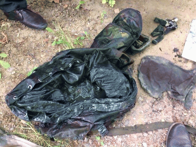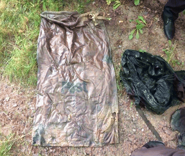 При собі мав на лівому плечі військову сумку, в якій знаходився мішок з написом «Post» з саперною лопаткою, налобним ліхтарем та капроновою мотузкою.