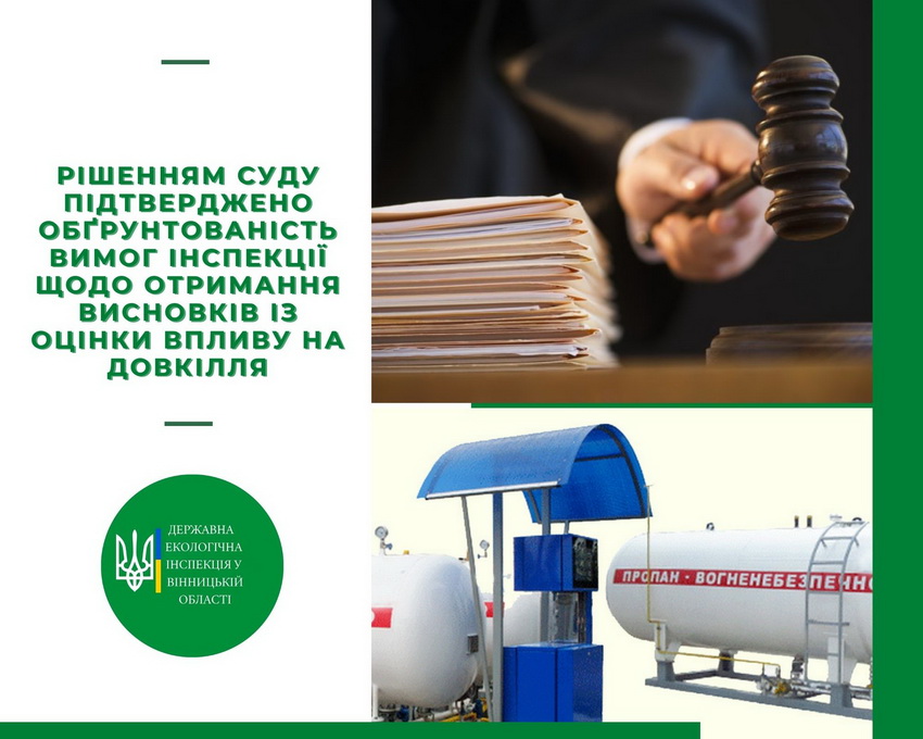 «За результатами заходів державного нагляду (контролю) спеціалістами Державної екологічної інспекції у Вінницькій області на території м. Жмеринка зафіксовано факт здійснення одним із суб’єктів господарювання монтажу та експлуатації стаціонарної ємності призначеної для зберігання скрапленого газу з метою його роздрібної торгівлі за відсутності позитивного висновку із оцінки впливу на довкілля. Відносно уповноваженої особи складено протокол за ч.1 ст.164 КУпАП який направлено на розгляд Жмеринського міськрайонного суду. Постановою Жмеринського міськрайонного суду від 19.07.2021 р. уповноважену особу визнано винною у вчиненні адміністративного порушення, на нього очікує штраф у розмірі 1000 неоподаткованих мінімумів (17 000 грн.)», - йдеться у повідомлені.