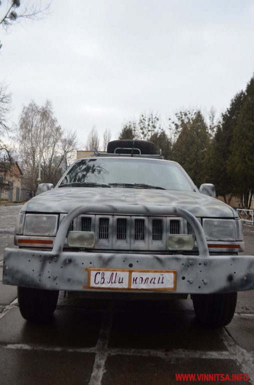 Посилки у зону АТО відправили на джипі від гурту от Vinta, Юрка Журавля, Лариси Полулях і диво-майстра Юрія Берко, автівку назвали «Святий Миколай» .
