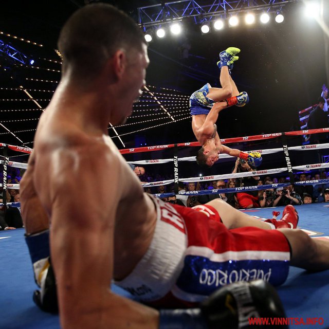 Украинский боксер Василий Ломаченко (6-1, 4 КО) стал чемпионом мира в двух весовых категориях, брутально нокаутировав в пятом раунде чемпиона WBO во втором полулегком весе пуэрториканца Романа Мартинеса (29-3-3, 17 КО).