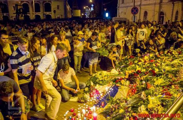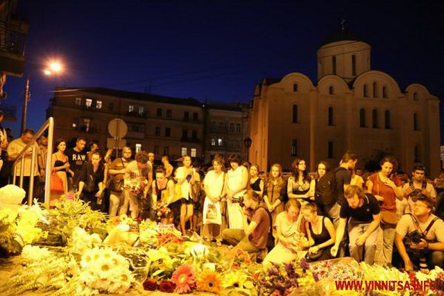 Тисячі українців прийшли до будівлі посольства Нідерландів у Києві, щоб висловити своє співчуття з приводу авіакатастрофи на Донеччині з пасажирським літаком Малазійських авіаліній, збитим, вірогідно, із зенітно-ракетного комплексу бойовиків «ДНР».