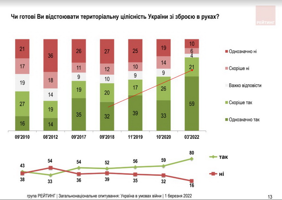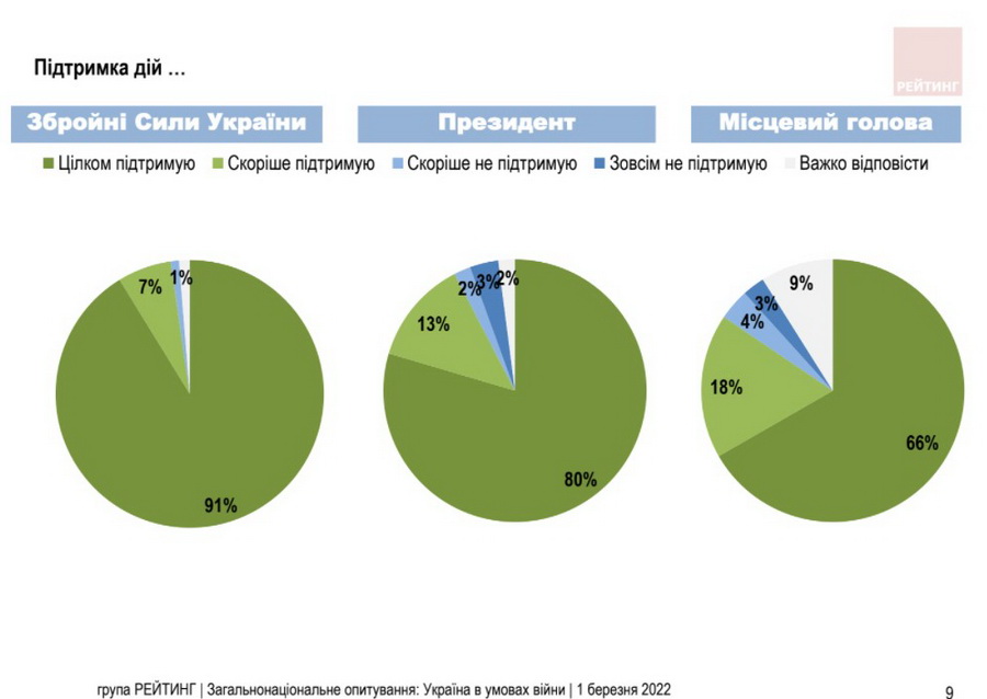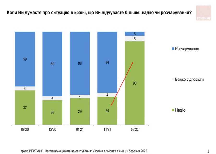 1 березня соціологічна група «Рейтинг» опублікувала результати загальнонаціонального опитування – України в умовах війни. 90% опитаних, думаючи про ситуацію в країні, відчувають надію. Лише 5% відчувають розчарування. У порівнянні з довоєнними часами кількість тих, хто відчуває надію зросла утричі. Практично у всіх регіонах спостерігається максимальний рівень відчуття надії.