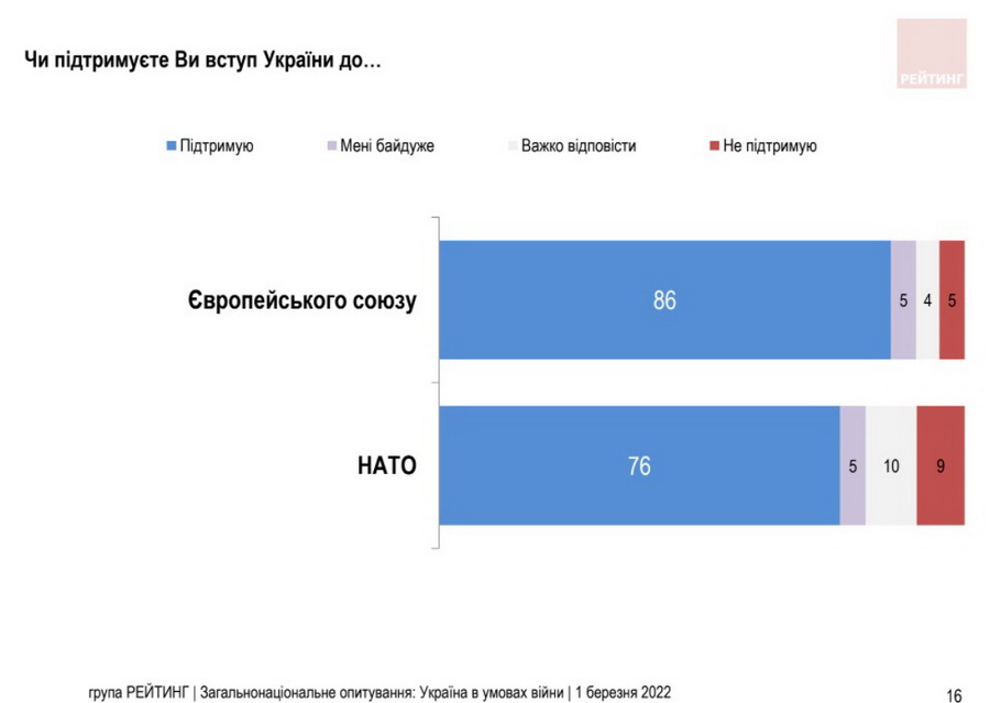 • Підтримка вступу України до Європейського Союзу та НАТО найвища за всю історію опитувань: 86% підтримують приєднання України до ЄС, 76% - за вступ в НАТО. У порівнянні з довоєнним періодом рівень підтримки вступу до ЄС та НАТО зріс більше ніж на 20 в.п. Позитивна динаміка відбулася за рахунок зростання підтримки вступу до західних структур серед населення Півдня та Сходу. У віковому розрізі в усіх категоріях спостерігається одностайна підтримка вступу України до ЄС та НАТО.