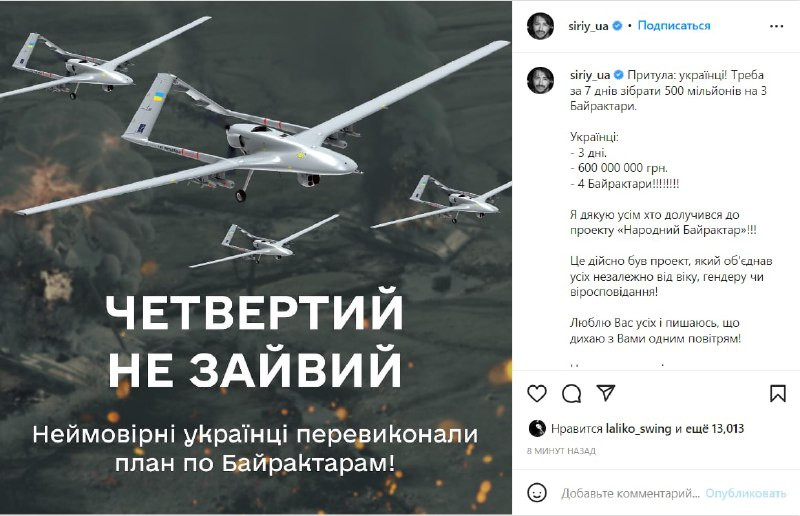 Українці за три доби назбирали 600 мільйонів гривень на купівлю чотирьох Байрактарів. Збір організував фонд Сергія Притули разом із блогером Ігорем Лаченковим.
