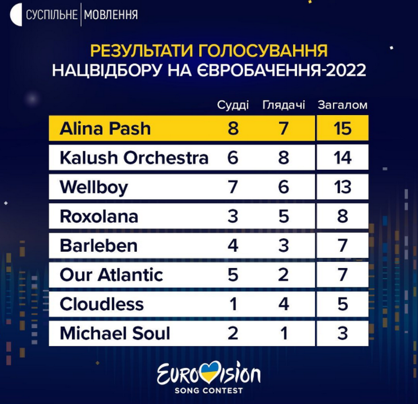 Перемогла закарпатська бітанга Alina Pash з піснею «Тіні забутих предків». Вона представлятиме Україну на Євробаченні-2022, яке пройде в травні у Турині.