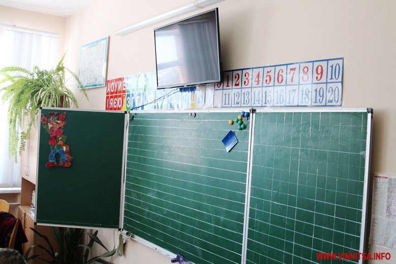 У кожній класній кімнаті плазмовий екран над дошкою. Нові шафи, полиці. При вході умивальник.