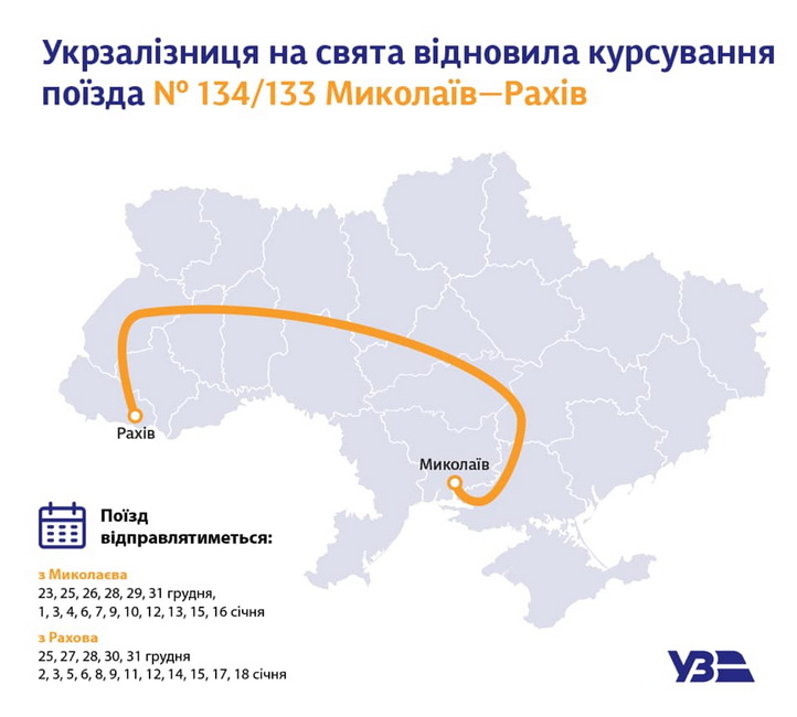 «Укрзалізниця» з 23 грудня і на період зимових свят відновлює курсування поїзда «Миколаїв – Рахів». Потяг проходитиме через Вінниччину.