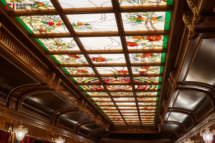 «На подвір’ї палацу стоїть щось велике, вкрите зеленою маскувальною сіткою. Зовні це схоже на теплицю або оранжерею. Зазирнувши під маскувальну сітку, можна побачити справжній залізничний перон, а на пероні – вагон-ресторан. Схоже, кум російського президента Путіна Віктор Медведчук дуже не хотів, щоб цей вагон потрапив комусь на очі – якщо, наприклад, маєток зніматимуть журналісти з дрона.