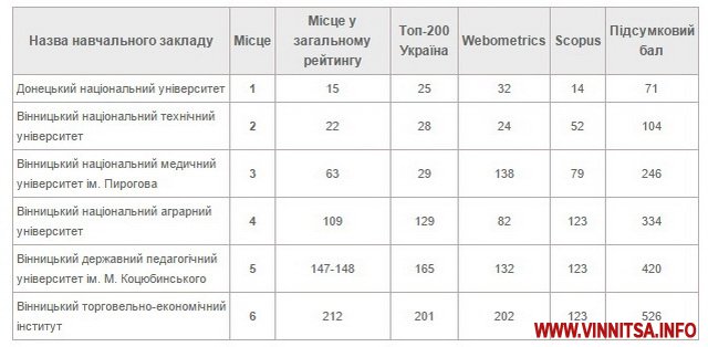 У загальному рейтингу вищих навчальних закладів України 2015 року Донецький національний університет посів 15 місце. Національний технічний університет - 22 місце. Національний медичний університет ім. Пирогова - 63 місце. Національний аграрний університет – 109, Державний педагогічний університет ім. М. Коцюбинського – 147-148. Торговельно-економічний інститут – 212.