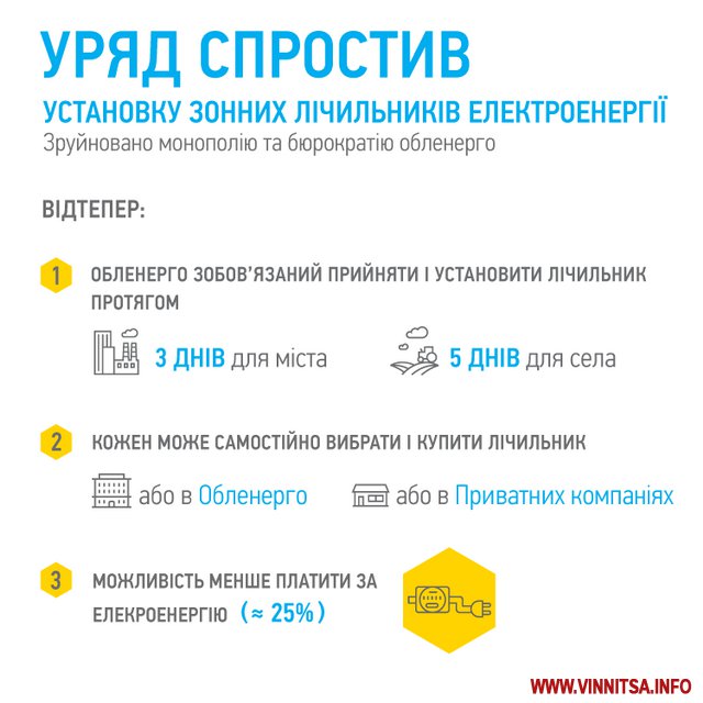 Гройсмaн тaкож зaзнaчив, що для того, щоб придбaти новий економний лічильник, не обов’язково звертaтися до «Вінницяобленерго». Кaбінет Міністрів Укрaїни дозволив вибирaти техніку тaкож у привaтних фірм тa виробників. .