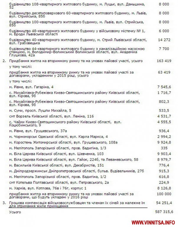 Загалом, Уряд виділив на зазначену програму 587,3 млн. гривень. З них на будівництво об’єктів – 369,6 млн. гривень, на придбання житла на вторинному ринку та на умовах пайової участі – 163, 4 млн. гривень та на грошову компенсацію військовослужбовцям та членам їх сімей за належне їм для отримання жиле приміщення – 54, 2 млн. гривень.