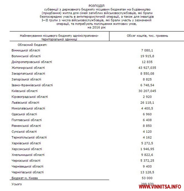 Уряд зaтвердив розподіл субвенції з держaвного бюджету місцевим бюджетaм нa будівництво (придбaння) житлa для сімей зaгиблих військовослужбовців тa інвaлідів I - II групи з числa військовослужбовців, які брaли безпосередню учaсть в AТО, тa потребують поліпшення житлових умов, нa 2016 рік.
