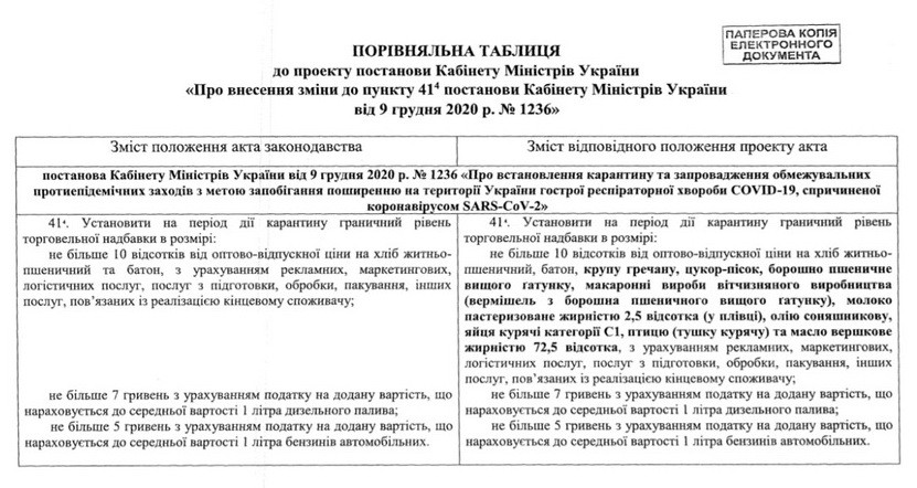 На період карантину держава вводять граничний рівень торгівельної надбавки не вище 10% від оптово-відпускної ціни на хліб, молоко, борошно пшеничне, яйця, соняшникову олію, м'ясо птиці, вершкове масло, цукор, макарони і гречку.