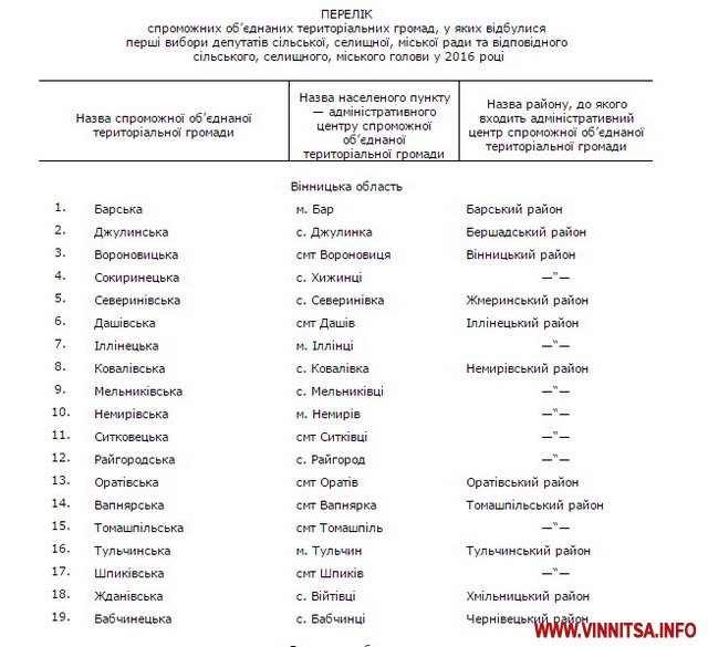 Так, у Вінницькій області затверджено 19 спроможних обєднаних теритріальних громад: Барська, Джулинська, Вороновицька, Сокиринецька, Северинівська, Дашівська, Іллінецька, Ковалівська, Мельниківська, Немирівська, Ситковецька, Райгородська, Оратівська, Вапнярська, Томашпільська, Тульчинська, Шпиківська, Жданівська, Бабчинецька.