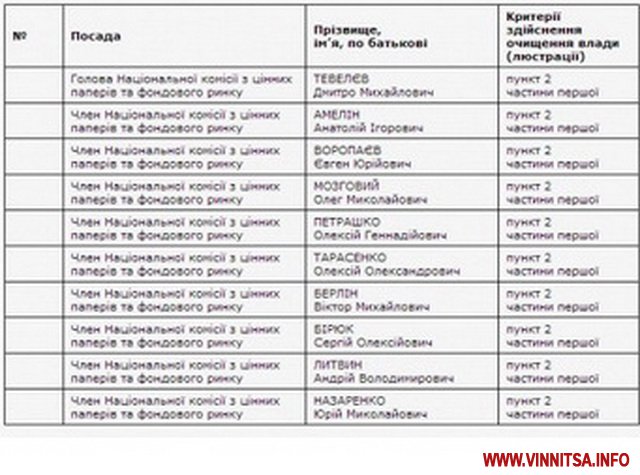 Список складається з декількох частин. У першій вказаний 21 високопосадовець центральних органів виконавчої влади, які звільнені відповідно до закону про люстрацію.