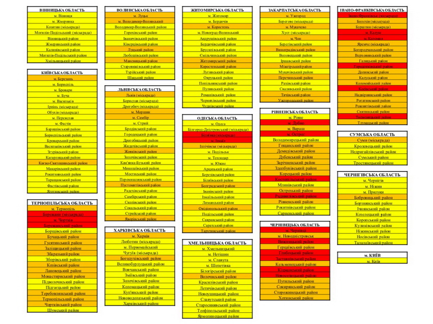 «Згідно з рішенням комісії, до «червоного» рівня віднесено: міста Івано-Франківськ, Коломия і Калуш, а також Городенківський, Косівський та Тисменицький райони Івано-Франківської області; міста Біляївка та Ізмаїл Одеської області; міста Дубно та Острог, Костопільський та Радивилівський райони Рівненської області; міста Бережани та Чортків і Бережанський район Тернопільської області; місто Чернівці та Вижницький, Глибоцький, Заставнівський, Кіцманський та Новоселицький райони Чернівецької області. Наголошую, що «червоний» рівень епідеміологічної небезпеки встановлюється виключно за показниками поширення коронавірусної хвороби у відповідних районах», — повідомив після засідання комісії очільник МОЗ Максим Степанов.