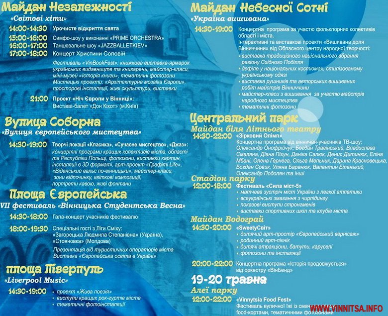 Нагадаємо, що 19 травня Вінниця святкуватиме День Європи. Традиційно у центрі міста розташуються десятки цікавих локацій. Обіцяють до півсотні фотозон, «живі» скульптури і фонтани, що рухаються. На сцені перед міськрадою виступить співачка Христина Соловій.