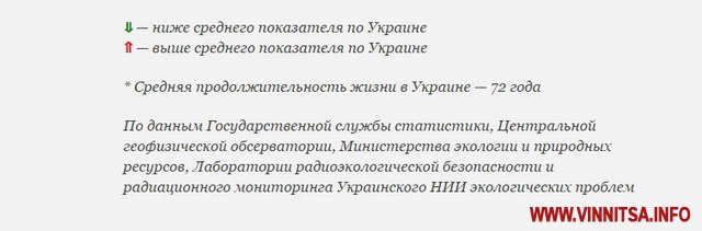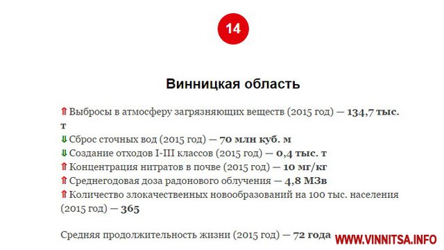 «…Ми взяли 6 показників: викиди в атмосферу забруднюючих речовин; скидання стічних, шахтно-кар'єрних і колекторно-дренажних вод; частка питної води, яка за якістю не відповідає стандарту; створення особливо небезпечних відходів I-III класів (неонові лампи, батарейки, кислоти і т. д.); концентрацію нітратів у ґрунті; а також середньорічну дозу радонового опромінення, одержуваного людиною, який 80% часу проводить в приміщенні. Ми спробували провести паралель між цими даними і двома показниками, що відносяться до здоров'я людини: кількістю злоякісних новоутворень і середньою тривалістю життя сукупно для чоловіків і жінок. Ми провели не зовсім звичайний експеримент і отримали в результаті цікаву картину. Найнебезпечніші для здоров'я - Дніпропетровська, Запорізька і Донецька області, найбезпечніші - Чернівецька, Закарпатська та Волинська», - пишуть кореспонденти видання.