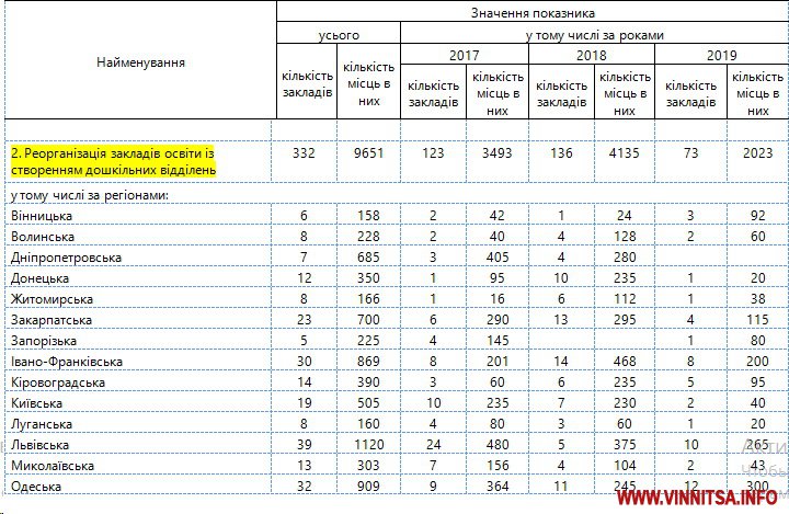 Провести реорганізацію 6 закладів освіти у Вінницькій області зі створенням дошкільних відділень на 158 додаткових місць.