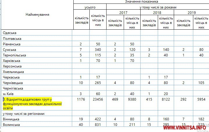 Уряд затвердив поетапний план дій на 2017—2019 роки поетапного створення додаткових місць у закладах освіти для дітей дошкільного віку. Наступного року у Вінницькій області планують відкрити 6 нових дитячих садочків на 560 місць.