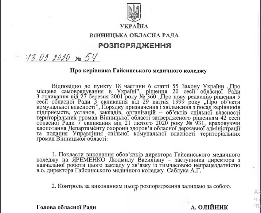 Причиною для зміни керівництва стала тимчасова непрацездатність виконуючого обов’язки директора коледжу Анатолія Саблука.