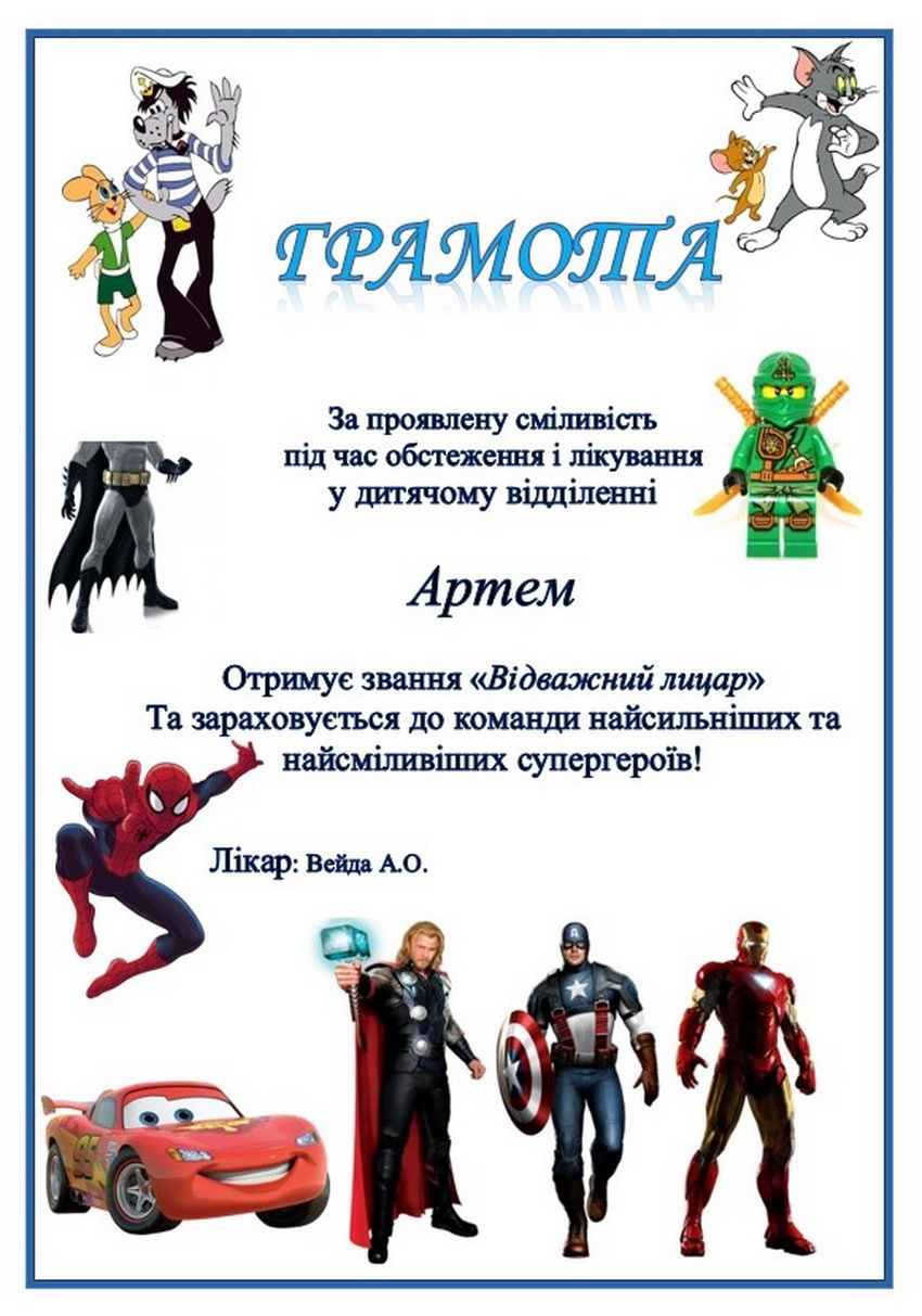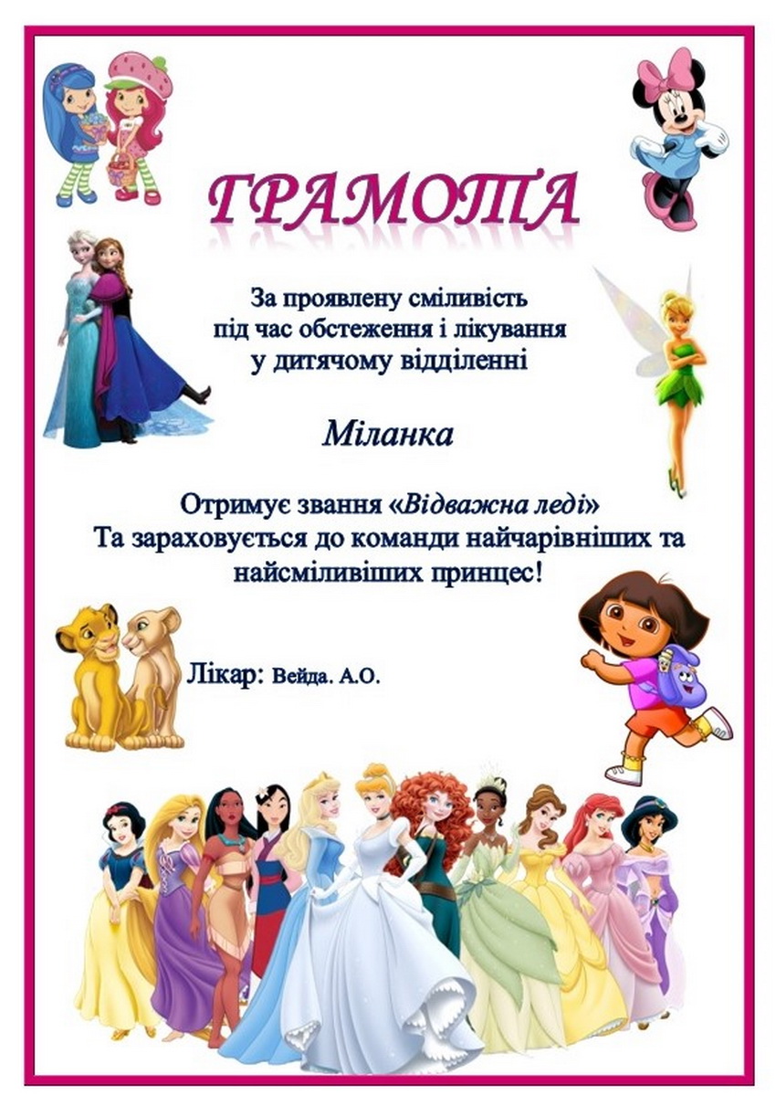 У дитячому відділенні Іллінецької міської лікарні маленьких пацієнтів підбадьорюють почесними званнями: «Найсміливіша принцеса» та «Відважний лицар». Почесні грамоти видають дітям по завершенню лікування.