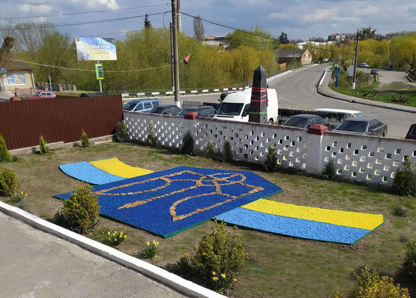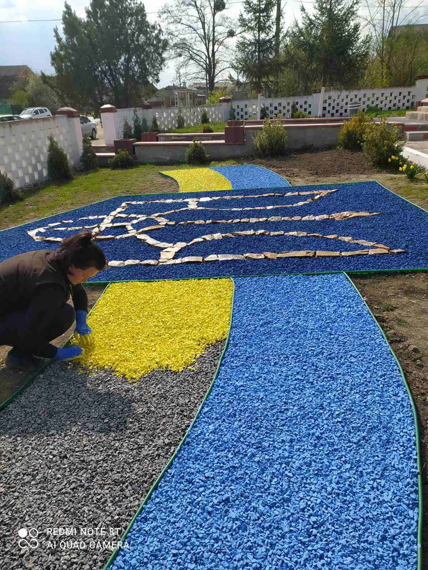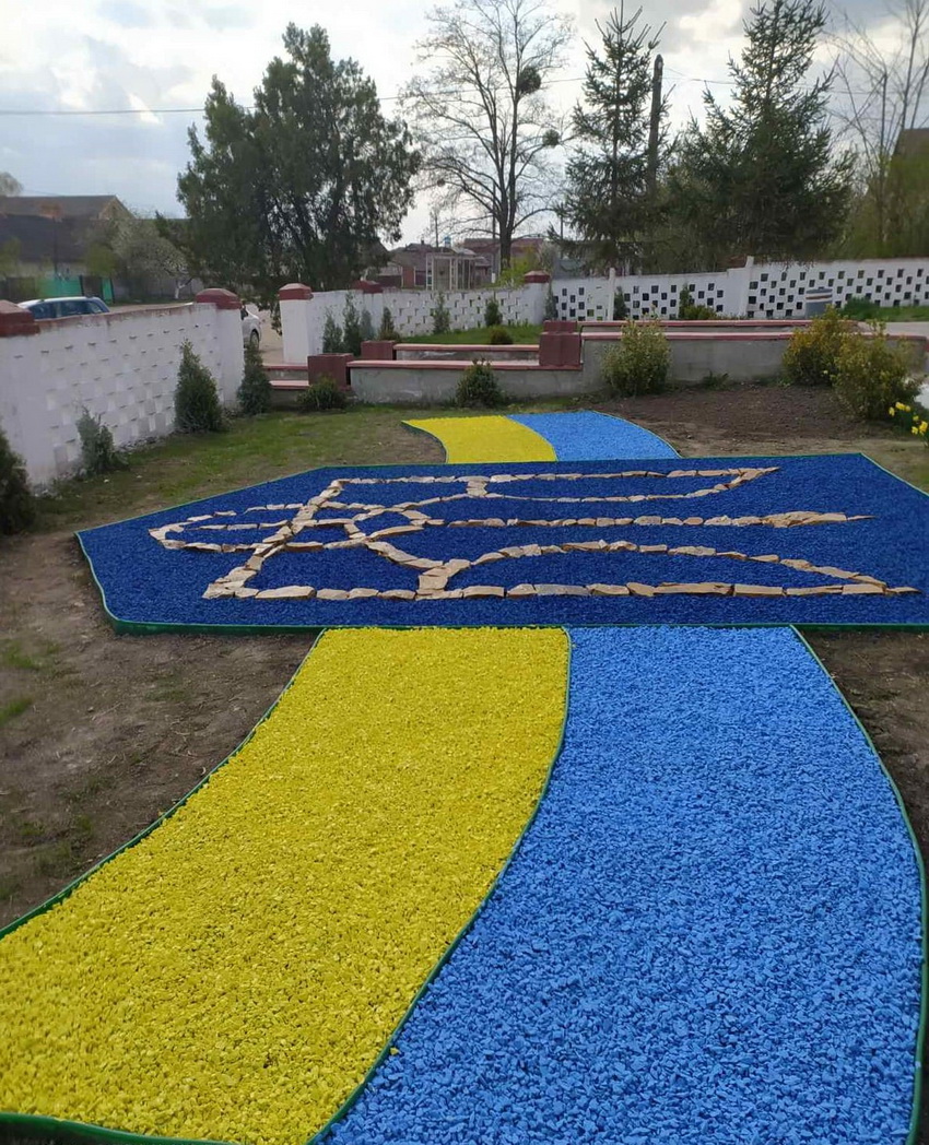 «Композиція, розміром 4 м на 7м, спочатку була викладена з декоративного каміння, а потім пофарбована у синьо-жовті кольори», - повідомили в Іллінецькій громаді.