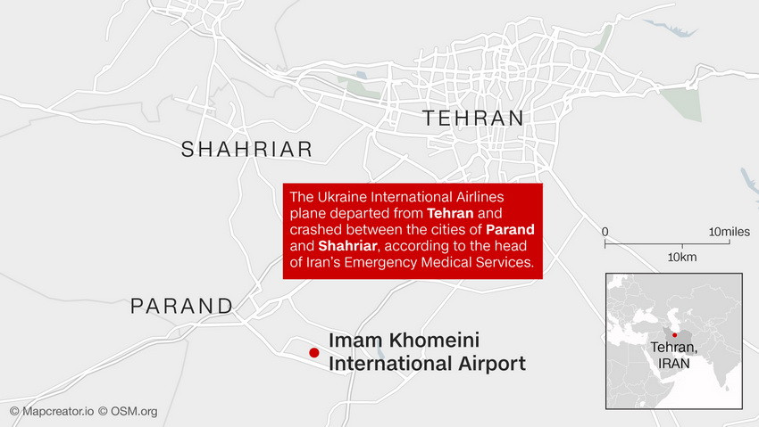 Boeing 737 авіакомпанії "Міжнародні авіалінії України" ("МАУ") розбився незабаром після вильоту з аеропорту Імама Хомейні в Тегерані.