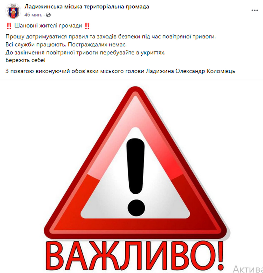 З повагою виконуючий обов’язки міського голови Ладижина Олександр Коломієць», - зазначено в повідомленні на сторінці Ладижинської міської ради.