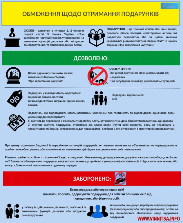 «Обмеження щодо отримання подарунків для осіб, зазначених в пунктах 1, 2 частини першої статті 3 Закону України «Про запобігання корупції» (особи, уповноважені на виконання функцій держави або місцевого самоврядування, та прирівняні до них особи) – коротко в інфографіці», - зазначено на сайті.